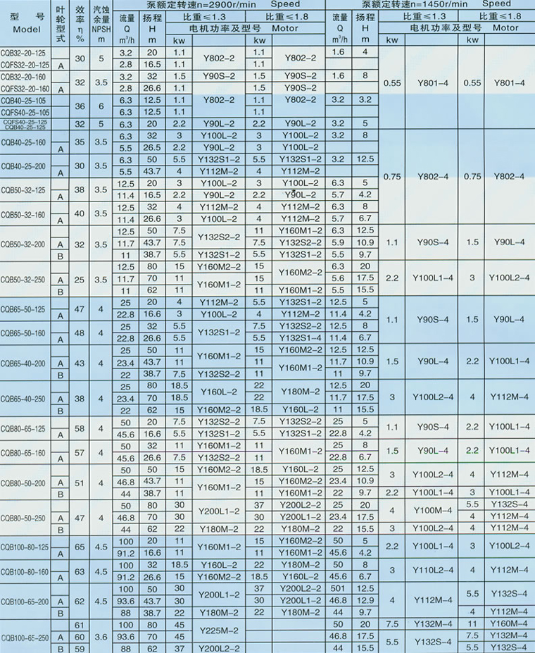 (1)CQFS系列采用全氟塑料增强合金制造功率在2.2KW以下)。