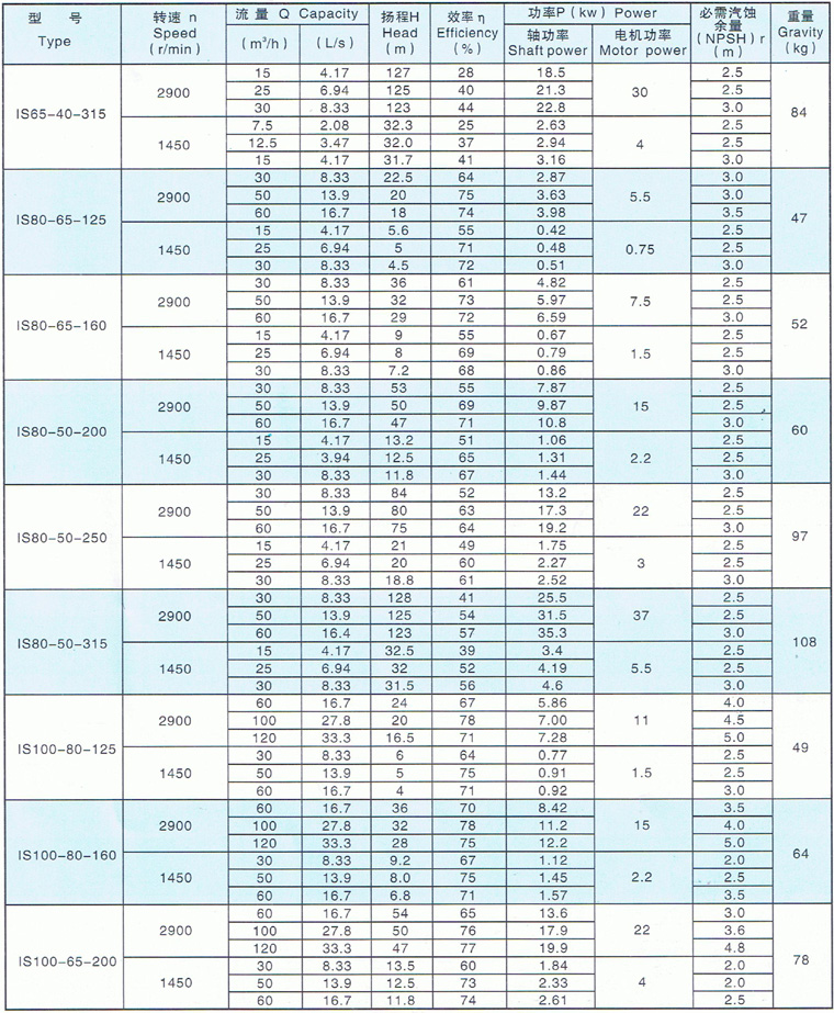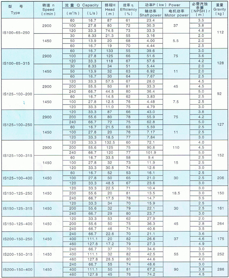 IS型泵系单级单吸(轴向吸入)离心泵/ISR型热水离心泵,适用于工业和城市给、排水及农业排灌。供输送80℃以下的清水及物理和化学性质类似清水的液体之用。IS型泵全系列共29种基本型,通过变速和切割叶轮直径,可获的153种性能供用户选用。